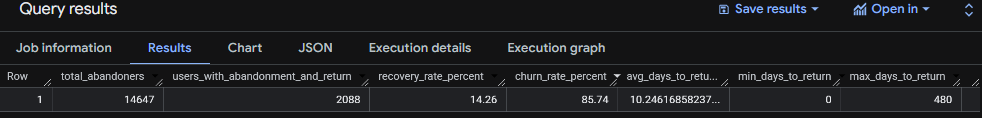 FROM user_days_diff;This query calculates key metrics related to users who abandoned their checkout and later made a purchase. It shows the total number of abandoners, how many returned to complete a purchase, the recovery and churn rates as percentages, and the average, minimum, and maximum number of days it took for users to return and buy.