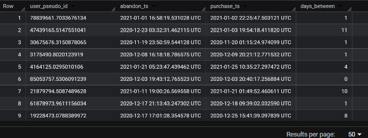 Editor's note: let's stop here for a second, before proceeding to the final output. The output of this CTE provides the abandonment and return by user, i.e. a full user list which you can then filter down into lists of users who return on the same day or the next day, or those who take a long time to return (possibly with a different cart by that time, so they've effectively abandoned their original one). In other words, you can create audiences this way, which you can then either analyze further, or use in other smart ways e.g. load them into Google Ads for remarketing, or launch email campaigns to help them on their journey.